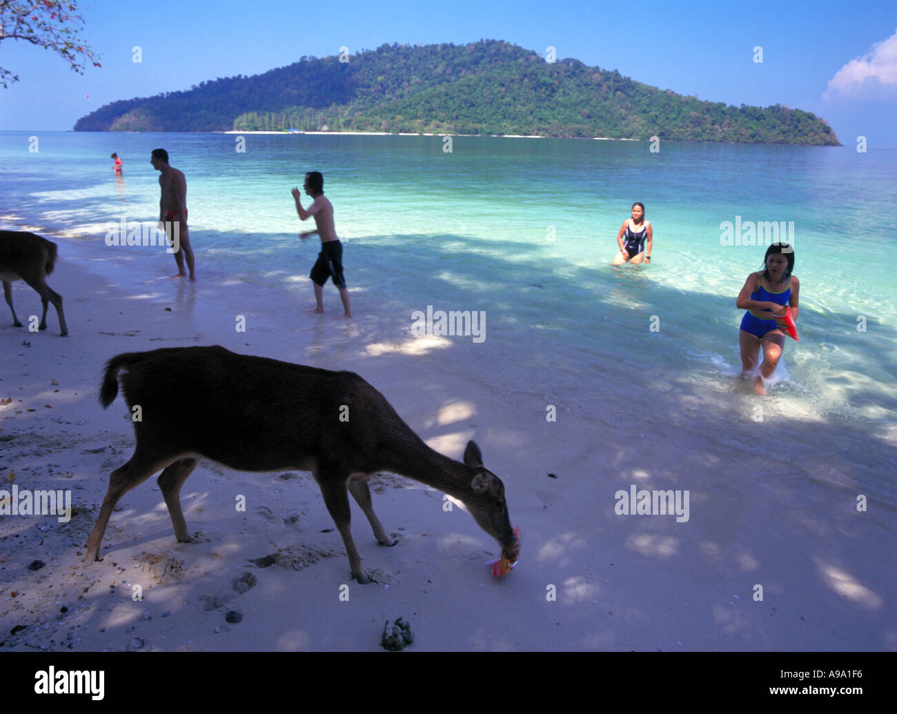 Malaysia Kedah Langkawi Pulau Singa Besar Wildlife Reserve Island Tourists In Water As Deer On Beach Eats Their Potato Chips Stock Photo Alamy
